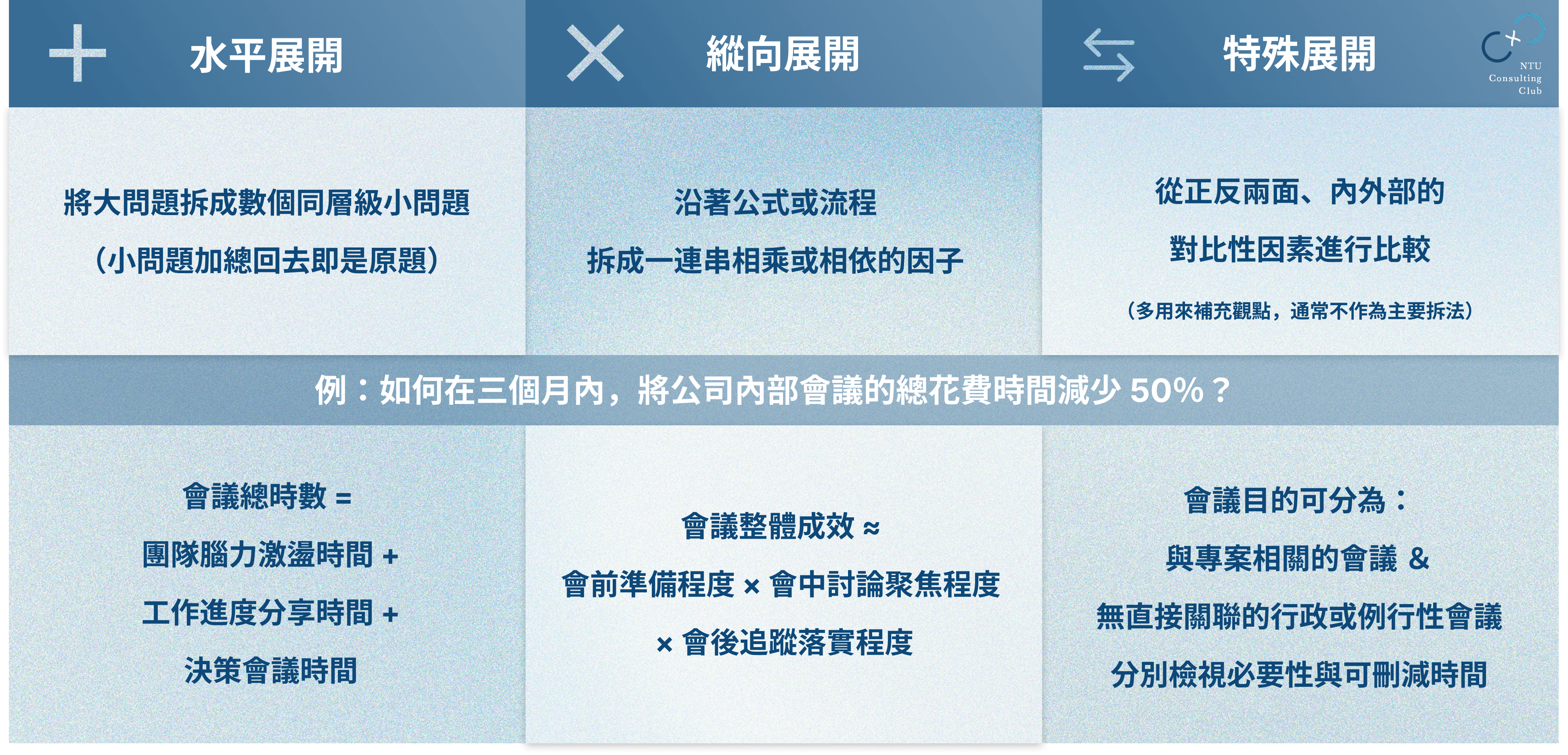 常見的拆解方式包括:水平展開的「加法」、縱向展開的「乘法」,以及對比式的特殊展開。