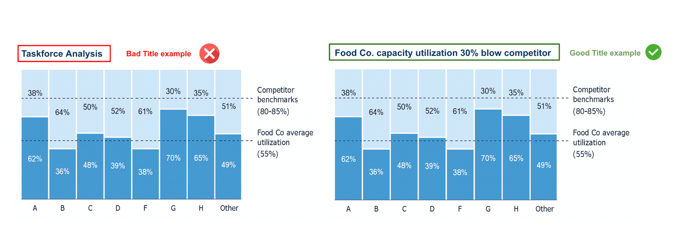 例如:「整體產能利用率較競品低 30%,建議優先調度 A/G/H 廠。」這樣的標題讓重點與行動一目了然。